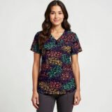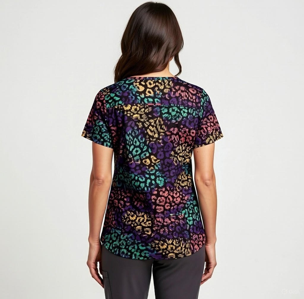 Designed with a bold abstract leopard-inspired pattern, this scrub top combines style and comfort. The lightweight, flexible fabric allows easy movement during long shifts. A classic V-neck design and functional front pockets make it both fashionable and practical for modern healthcare environments.
