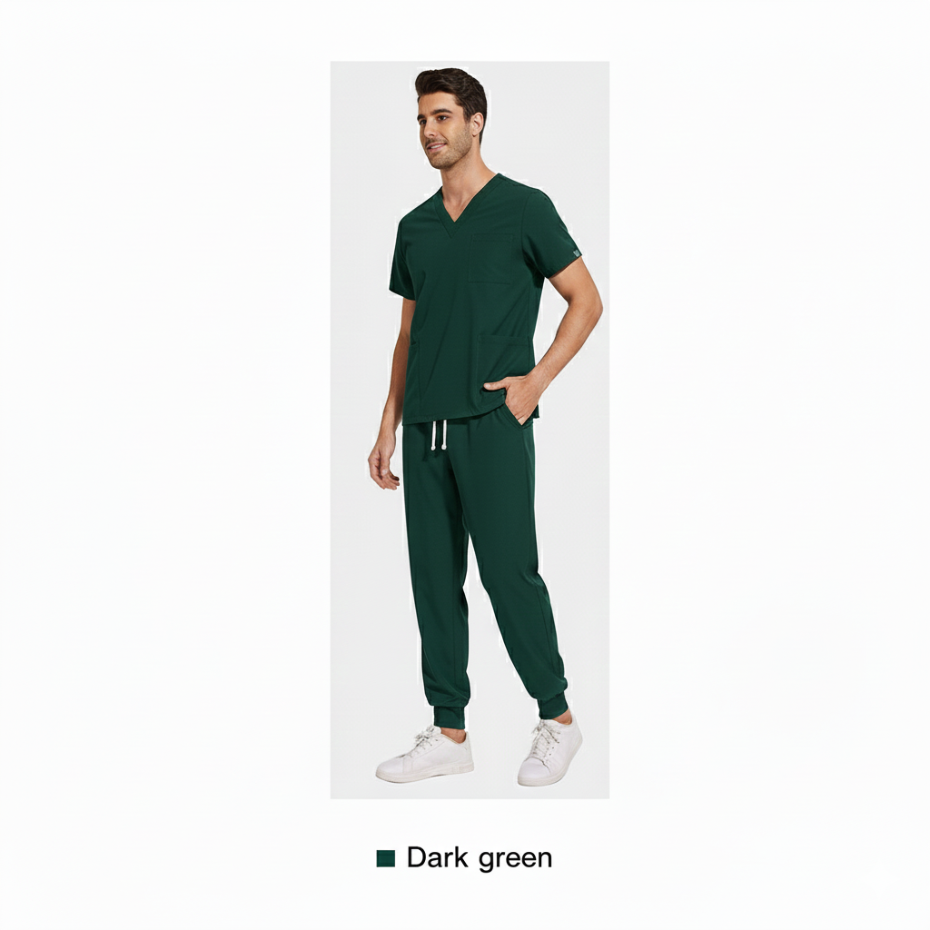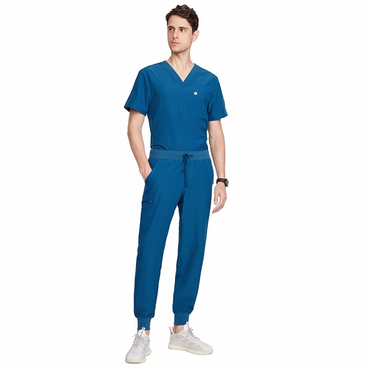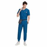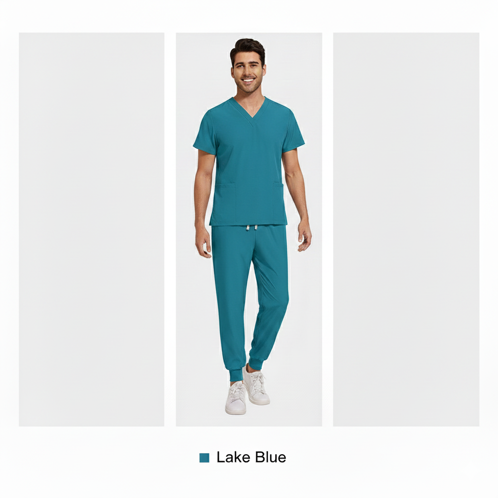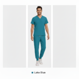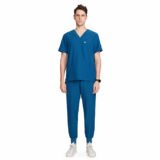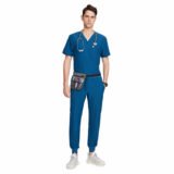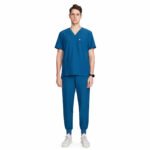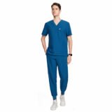 This teal blue scrub set is designed for comfort, durability, and a smart professional look. Made from soft, breathable fabric, it ensures ease of movement and comfort during long working hours. The V-neck scrub top with functional pockets and matching jogger-style pants provide a modern fit, making it ideal for doctors, nurses, and healthcare professionals.